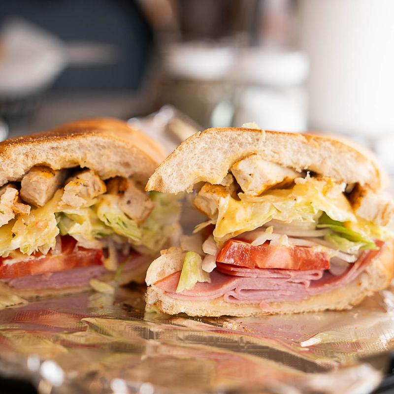 Ham, cheese, chicken, honey mustard, mayo, lettuce, tomato, onion.